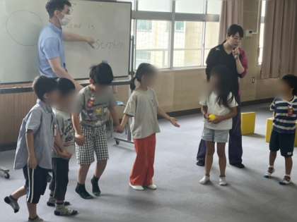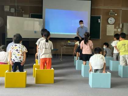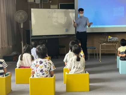 今週から3週連続で、1.2年生が英語の授業を受けます。外国人の講師に来てもらい、ネイティブの英語に触れる活動です。まず初めは、自己紹介「my name is〜」
