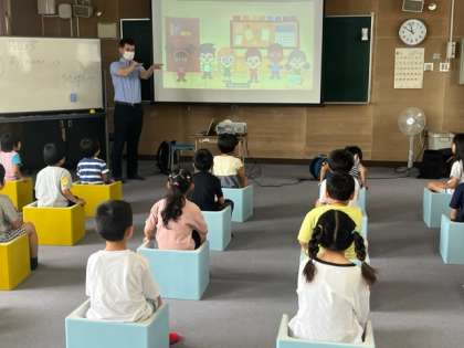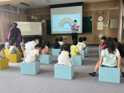 “HELLO song”のあとは、虹の色を発話します。red.orange.〜大きな声で言えたね。
