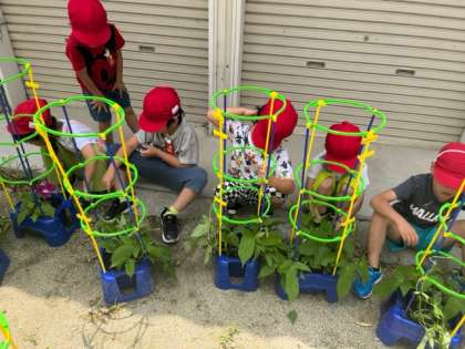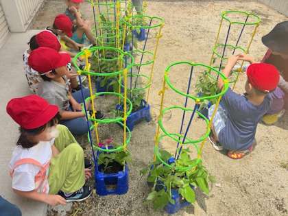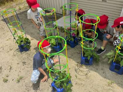 1年生が春にタネをまいた朝顔のツルを支柱に巻き付けていました。もっともっと大きくなっていっぱい花が咲きますように。