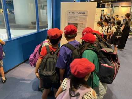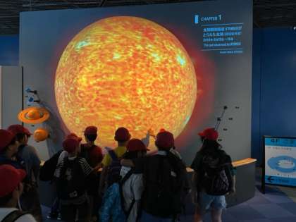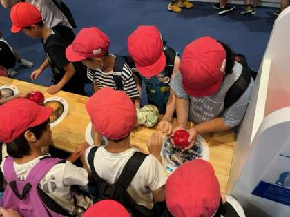 科学館の見学では、宇宙のコーナーで体験をしました。りんごは太陽の引力でどれくらい重くなるのかな?