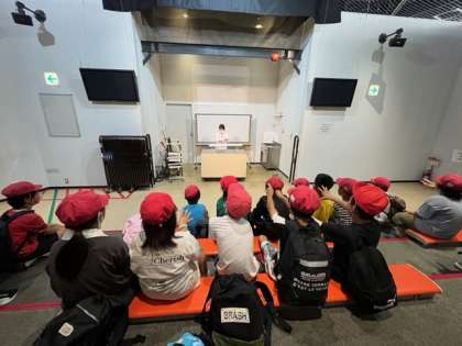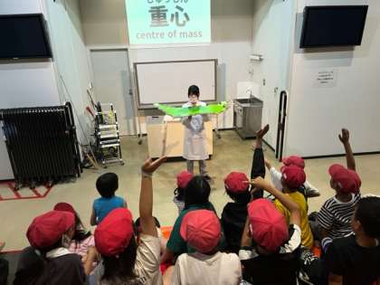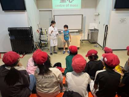 サイエンスショーでは、重心を探してものを支えるマジックを見せてもらいました。飛び入り参加もできました。