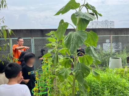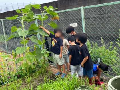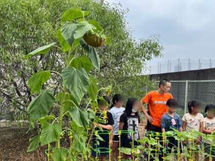 3年生が理科の時間に学習園の植物を観察していました。大きなひまわりを見て、花が終わっていることや、はの大きさなどいろいろ発見していました。