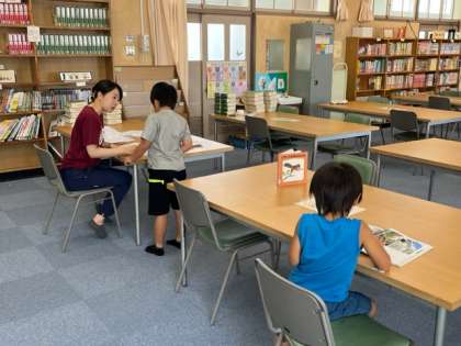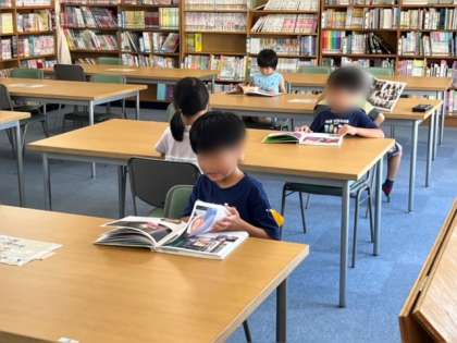 1年生が図書室にいました。図書の時間です。ジブリの作品に人気が集まっていました。文字もしっかり読んでるね。