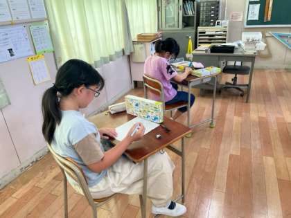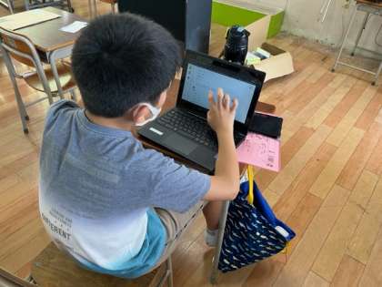 6年生が図工の時間に「テープカッター」のイラストを決めていました。ウェブで探したり自分で描いたりして決めていました。早く終わったらデジタルドリルで学習しています。