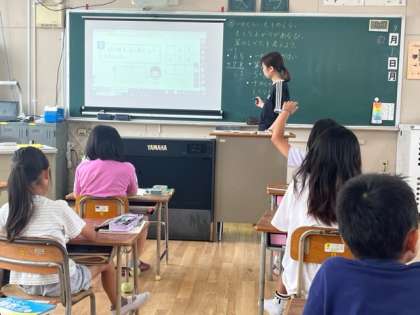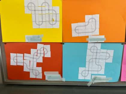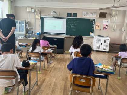2年生が算数の時間に「たし算の筆算」の学習をしていました。掲示板には、前に作った線路図が掲示されていました。