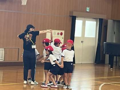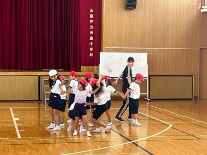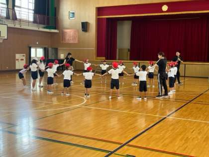1.2年生が体育館で体育をしていました。鬼ごっこやなべなべそこぬけなどの運動遊びをしていました。水分補給を10分に1回して熱中症対策もしていました。