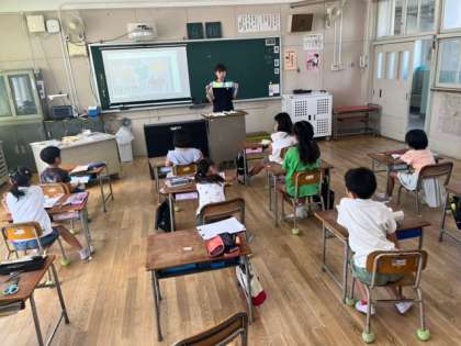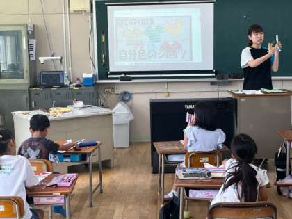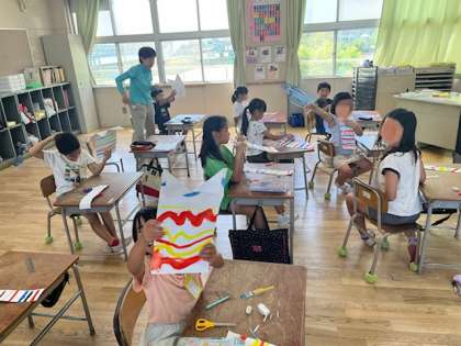 2年生は、絵の具を使ってカラフルなTシャツを作っていました。これから袖を作るようです。