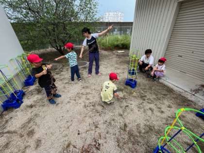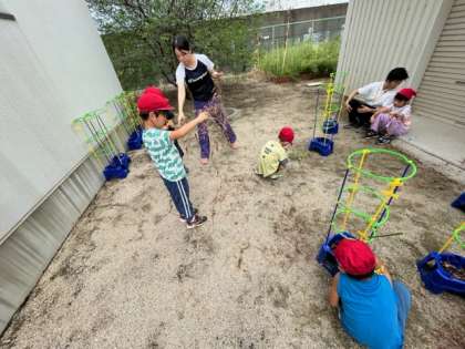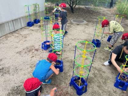 1年生が学習園の近くであさがおのツルを集めていました。ていねいにはさみで切って、絡まらないように集めていました。