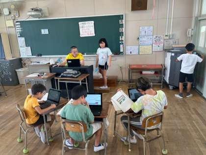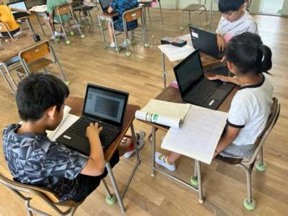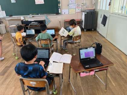 3年生が国語の時間の発表用スライドを作っていました。習い始めたローマ字の表を見ながらローマ字入力をしています。写真をwebから探している子もいます。