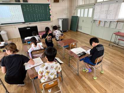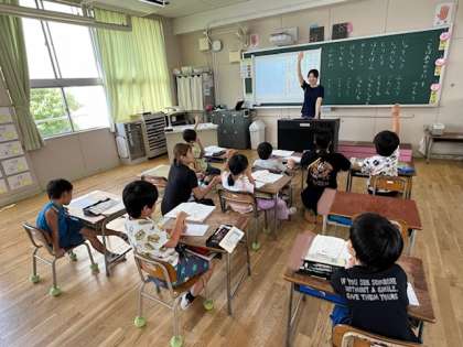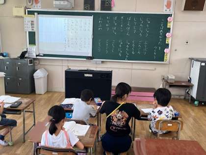 1年生は「ことばあそびうた」をしていました。「だいこん」「たまご」「ピーマン」と考えたことばに音をつけます。たまごはトントンがいいみたい。