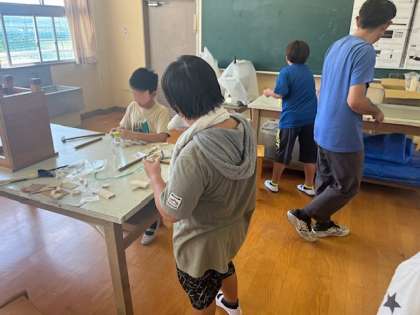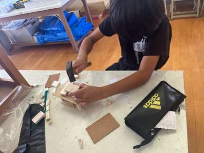 3年生の図工では、木材に釘を打ちつけてつないで作品にしていました。小さい箇所にくぎを打つのはたいへんですね。