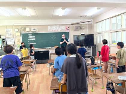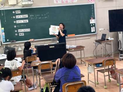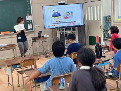4年生の外国語活動です。it's lunch time.みんなで曲に合わせて練習です。