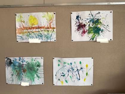 水彩絵の具の画法です。垂らした絵の具をストローで吹き飛ばしたり、画面を傾けて垂らしたりして表現します。これも、コロナ禍ではできなかった学びです。