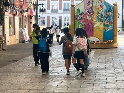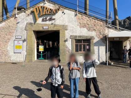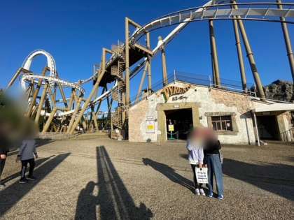 ジェットコースター前での記念撮影。お土産を買って残り時間を気にしながら最後まで楽しみます。