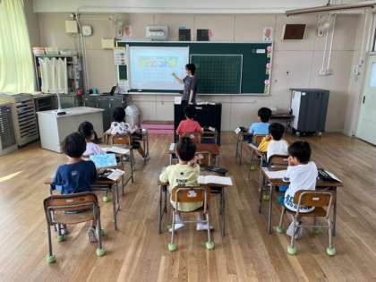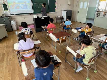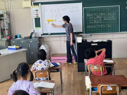 1年生が算数の時間に「くりあがりのあるたし算」を学習していました。さくらんぼを使って解いていきます。
