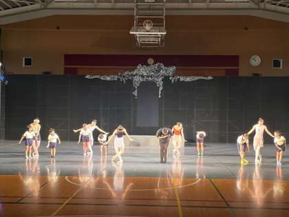 講堂が劇場になりました。バーレッスンの他には、ダンサー体験をします。お辞儀素敵ですね。