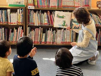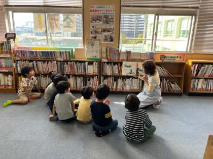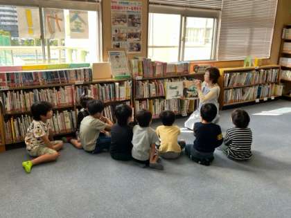 1年生は図書館司書の先生に本の読み聞かせをしてもらいました。真剣に聞いてきますね。