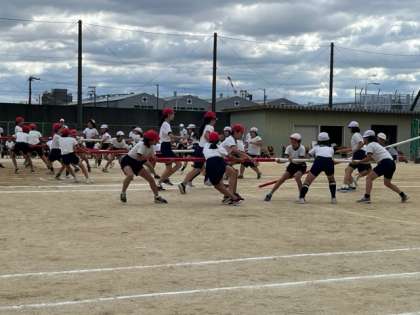 5.6年生の団体競技は、棒引きです助けたり助けられたり。