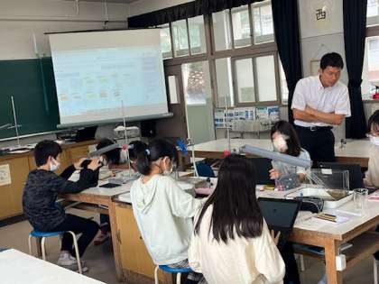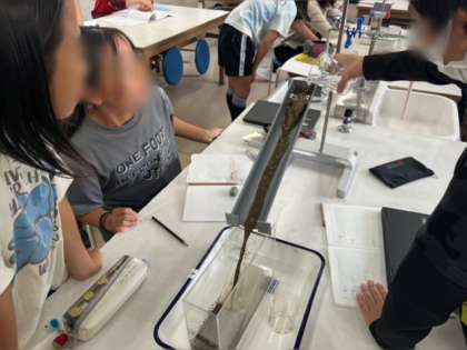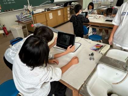 実験で堆積の様子を確認して、学習者用端末で写真を撮りみんなで共有していました。