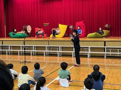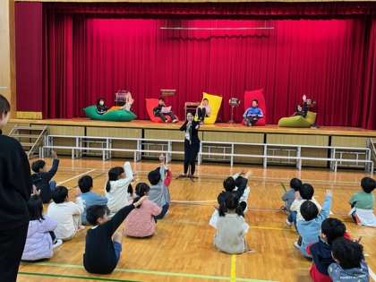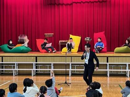 今朝は臨時の全校朝会を行いました。港区の山口区長様がお越しになりました。Yogiboの会社から贈呈いただいたソファを紹介してくださいました。