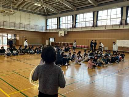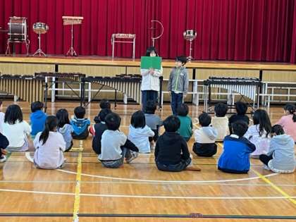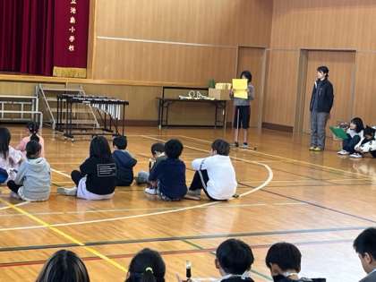 今日は、「池島ふれあい祭り」の時に演奏する曲を相互に鑑賞し合いました。代表委員会の人のあいさつから始まります。