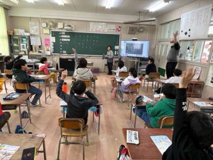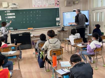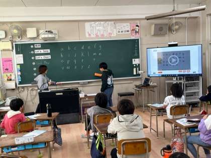 4年生が外国語活動の時に「アルファベットソング」を歌っていました。アルファベットを消しても歌えるかな?