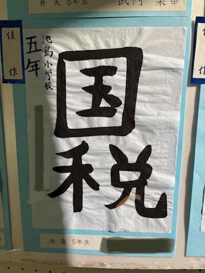 港区民センターに池島小学校代表の人の「税に関する習字」が貼られていました。