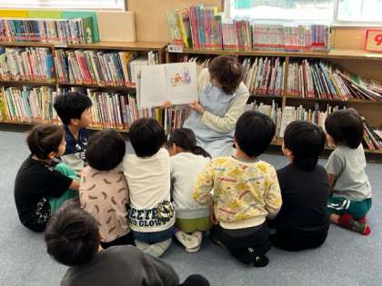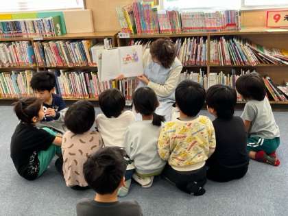 1年生が図書の時間に絵本を読んでもらいました。司書の先生のお話をじっと聞いていますね。