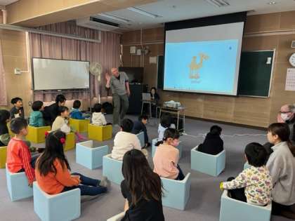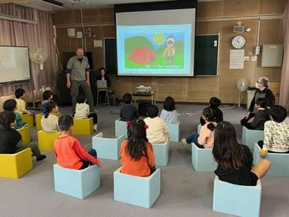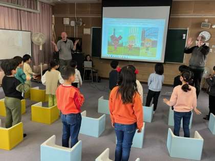 1.2年生のEnglish timeです。民間の講師に来てもらって学びます。ネイティブの発音が聞き取れなくても楽しく活動してます。