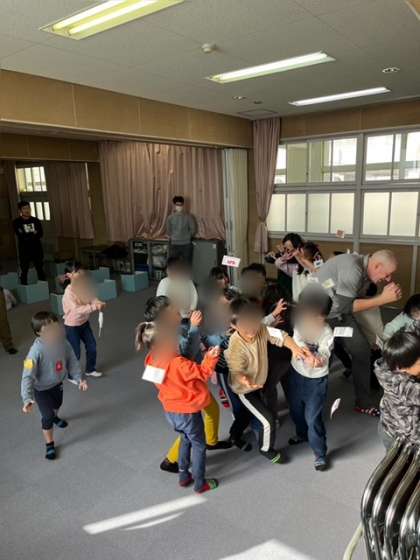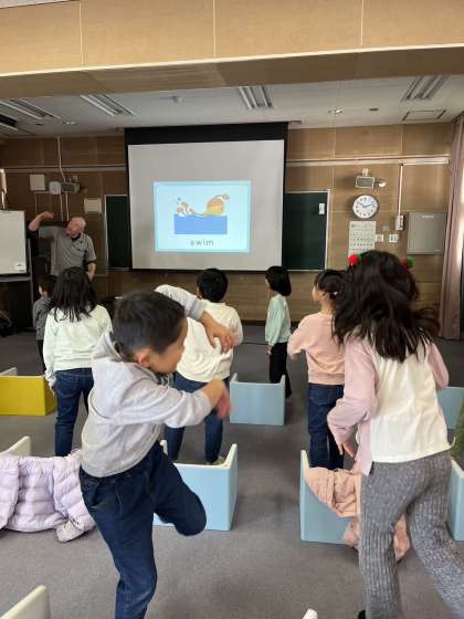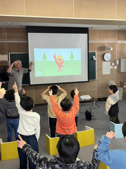 1.2年生は2学期のEnglish time2回目です。今日は歌に合わせて体を動かしたり、動物になってみたり、とても楽しい学習です。