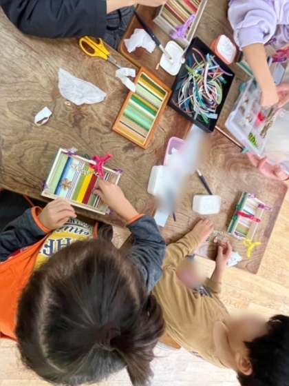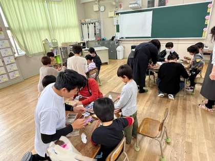 ボンドを塗ってテープや飾りを貼り付けていきます。1年生にとっては手先を使う難しい工程です。