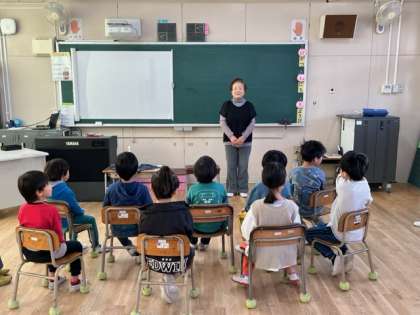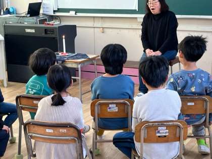 今日は図書ボランティアさんによる「お話会」の日です。1年生は「うさぎとおおかみ」のお話を聞きました。