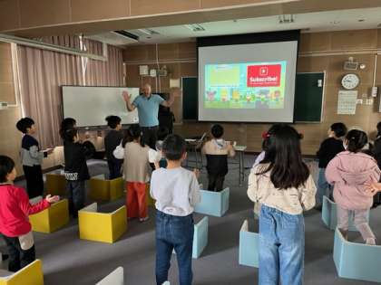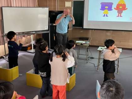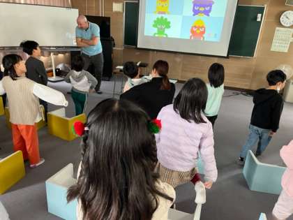 今日も英語のレッスンがあります。1.2年生のみんなは歌声もとても大きくなりました。ジェスチャーもとても上手だね。