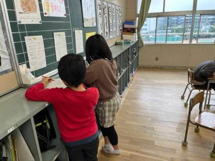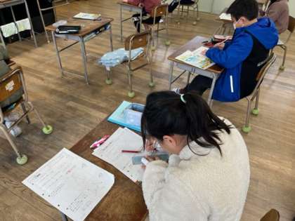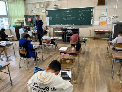 3年生は、算数の正三角形、二等辺三角形の作図などのプリントをしていました。コンパスや定規を使って上手にかいています。