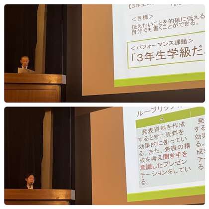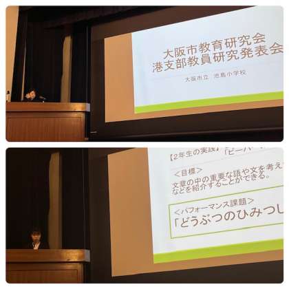 > 港区教員研究発表会で、池島小学校の4人の先生が国語の研究について発表しました。