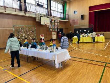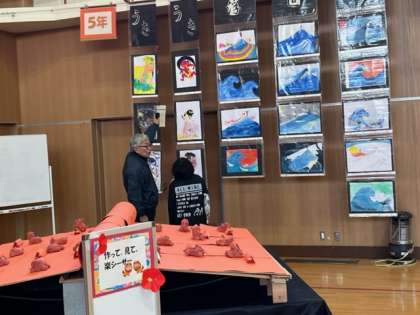 作品展の展示を見に行きました。5年生はじっくり見ています。