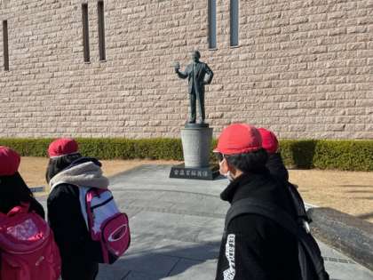 5年生は社会見学で「カップヌードルミュージアム」に行きました。安藤百福像に挨拶をして館内に入ります。