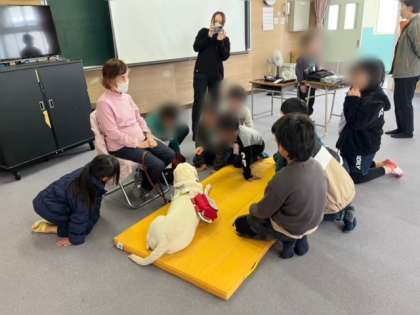 3年生が福祉体験学習として、視覚障がいのある方と盲導犬とのふれあい活動をしました。お話をお聞きした後、いろいろな体験をしました。
