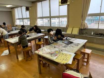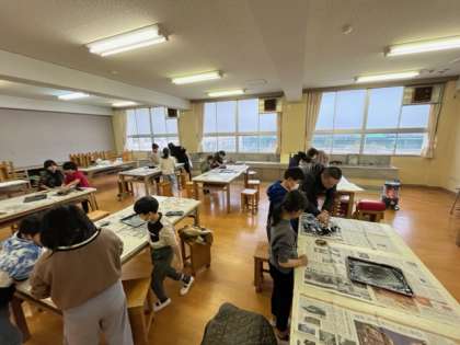 3年生は図工室で版画の印刷をしていました。インクをたくさんつけてバレンで写し取ります。