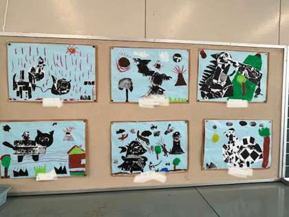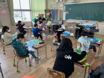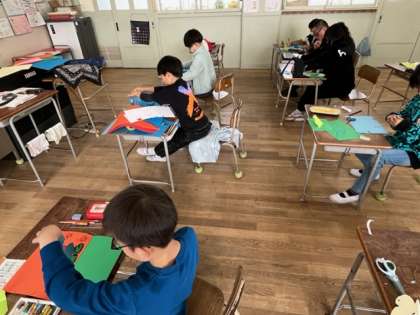 3年生は立体の作品を作っています。とびだす絵本のようです。ハサミとノリを使って仕上げています。版画もとても上手なんです。