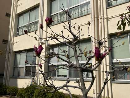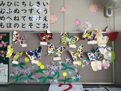 1年生の教室にたくさんのかわいいちょうちょが飛んでいます。木蓮の花も開き始めて、春がやってきました。