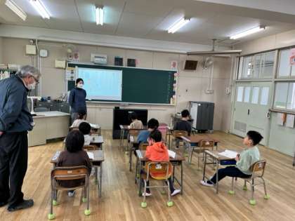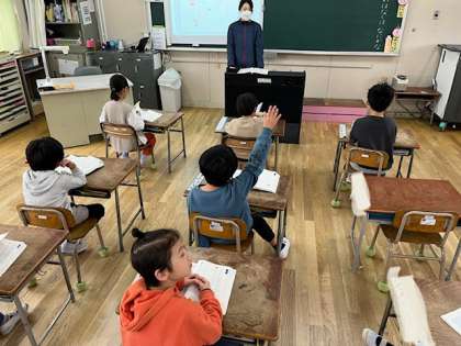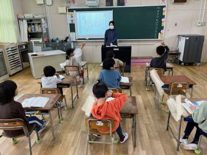 1年生が「本をしょうかいしよう」と言う学習をしていました。好きな本を探して、次の1年生に紹介するみたいです。