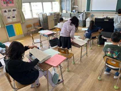 2年生の教室では、テスト返しが行われていました。学期末の光景です。きちんとたたんで入れてます。