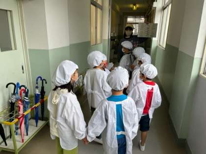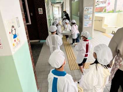 1年生は初めての給食です。2年生と力を合わせて運びます。