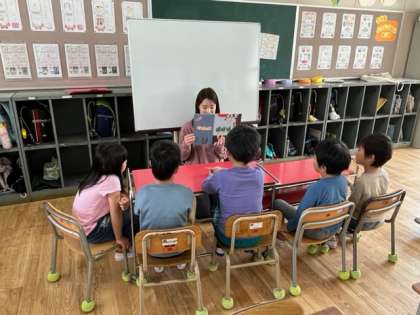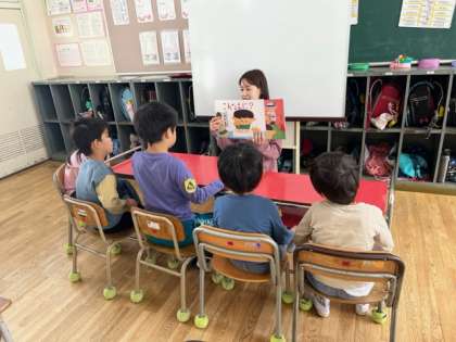 1年生が食育の学習で「食べ物のなまえ」をしていました。初めは、ちくわのお話の絵本を聞いています。