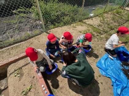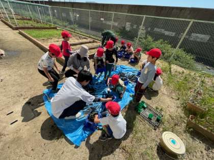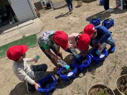 植木鉢に土をたくさん入れて、アサガオの種を植えます。2年生はミニトマトのなえをうえます。どちらもやさしくしないといけません。植え終わったら、たっぷり水をあげました。