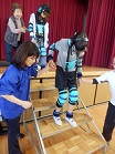 体の動きが抑制される道具を身につけ、歩くことがどれだけ大変かを体験することができました。