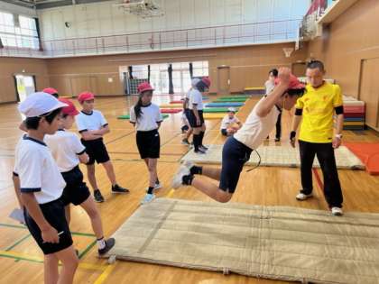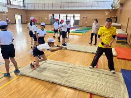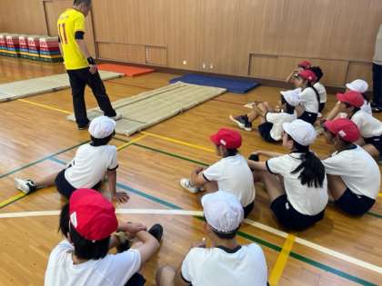 6年生は体育館で立ち幅跳びをしています。2メートル跳ぶ!がんばれ!