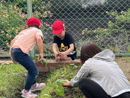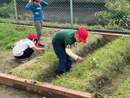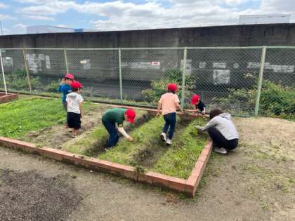 1年生がお芋畑の雑草を掃除していました。雨上がりの今日は土が柔らかくて取りやすいみたいです。