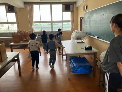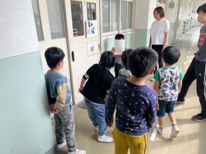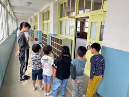 1年生の生活科の学習で「がっこうたんけん」をしていました。2年生が部屋の前で部屋の説明をしています。